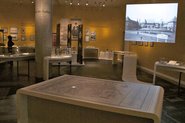 Projektion von Postkartenansichten im programmierten Endlosbetrieb auf eine Fläche von 2,00 x 1,50 Metern mit synchroner Schaltung von Leuchtanzeigen der zuordbaren Standorte auf einer Karte des Bugra-Geländes.